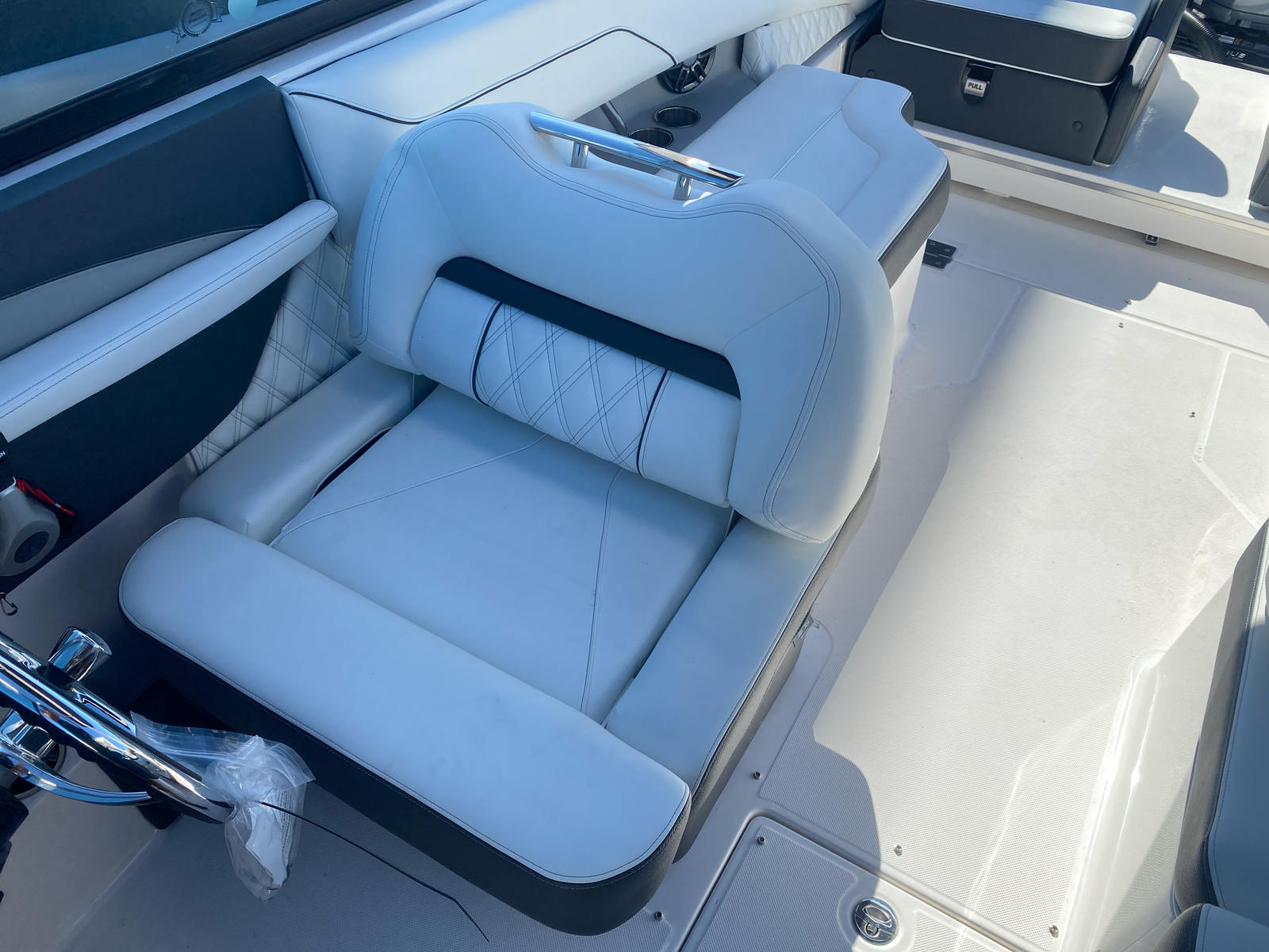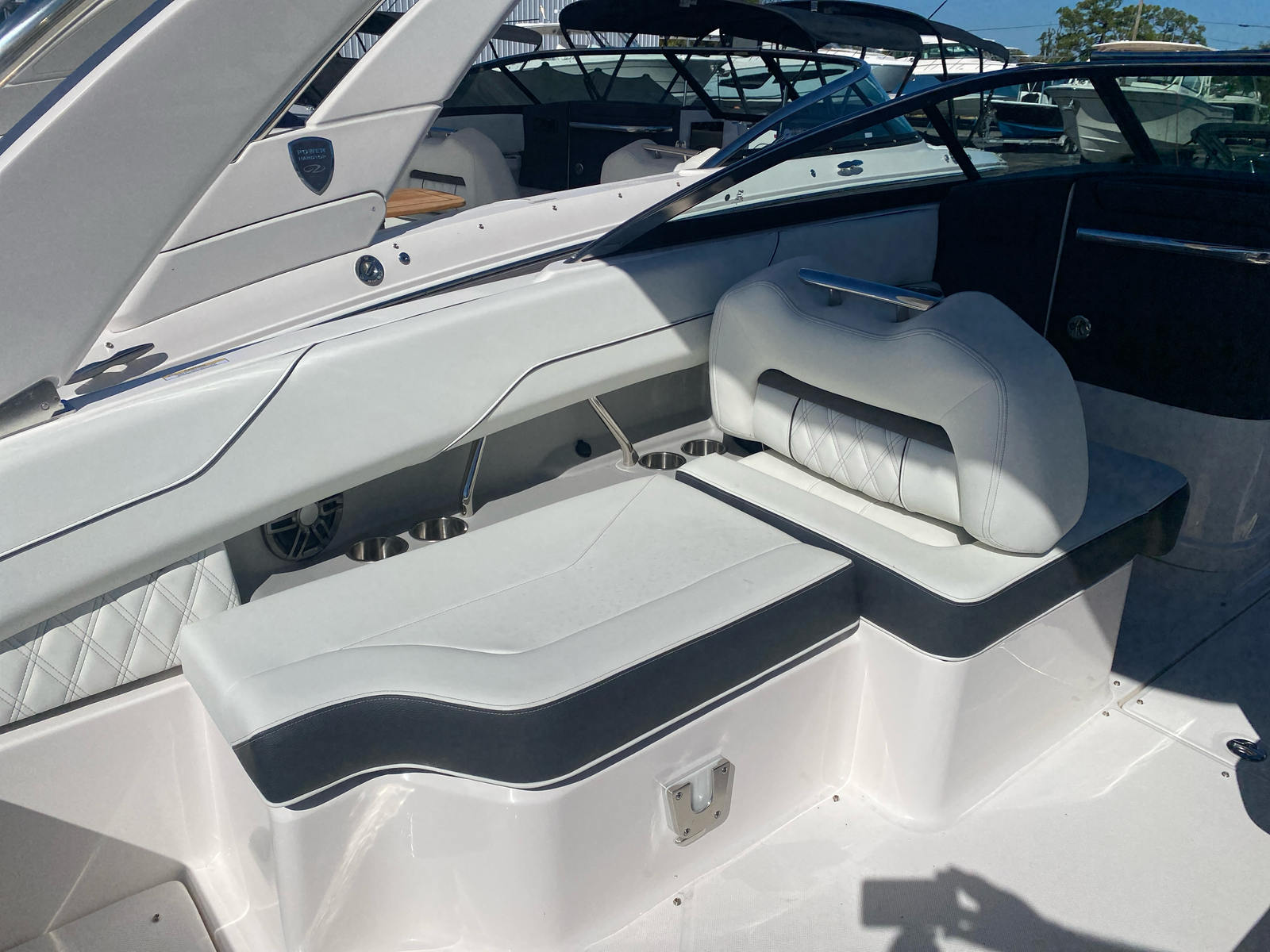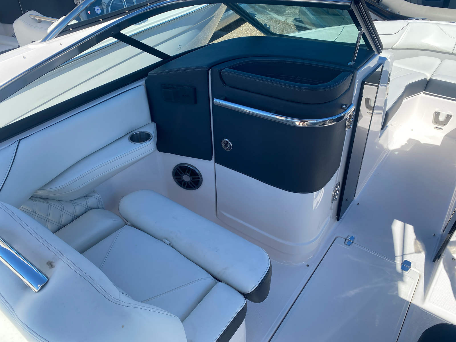The Regal LX4 Bowrider is equipped with a suite of premium features designed to enhance your boating experience. Enjoy the convenience of a transom shower and pressure water package, perfect for rinsing off after a swim or cleaning up before heading ashore. The Mediterranean Blue BootStripe and Tahiti Beach White bottom color not only add elegance but also ensure your boat stands out in any marina.Step inside the head compartment for added comfort and privacy during longer outings. The PowerTower in white provides easy storage for water sports equipment and offers shade when needed. Trim tabs allow for precise control and stability, ensuring a smooth ride regardless of water conditions.Navigation is a breeze with dual Garmin 943XS displays and a B60 transducer, giving you advanced chart plotting and fish-finding capabilities. Docking lights enhance safety and visibility during evening arrivals, while the battery charger keeps your electronics powered throughout your adventures. Bow and cockpit covers protect your investment from the elements, preserving the LX4’s pristine condition for years to come.
