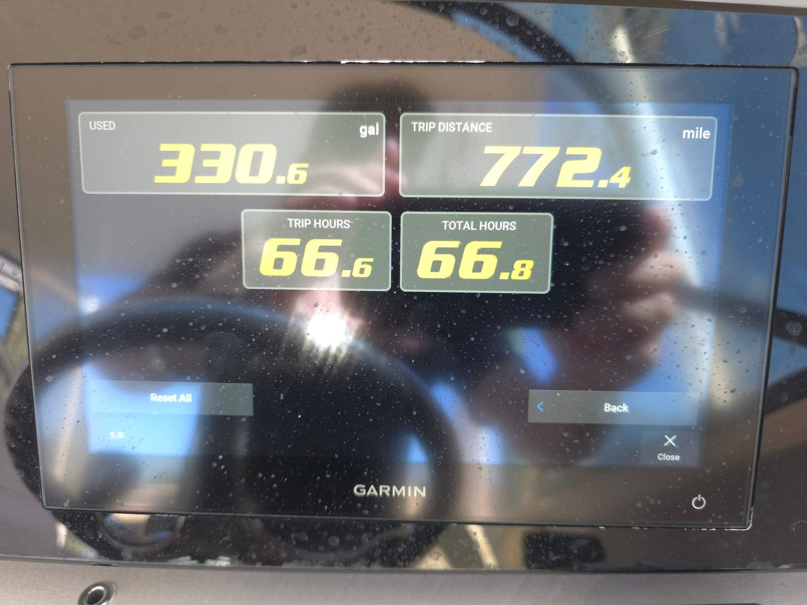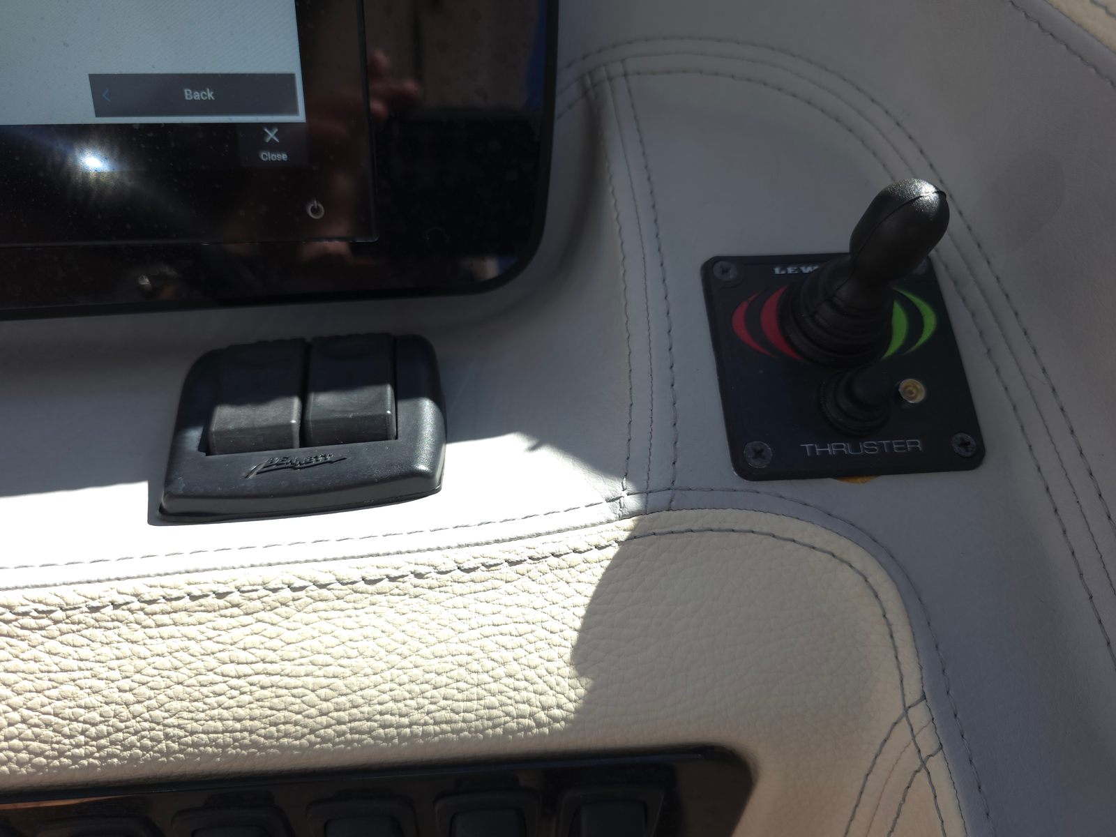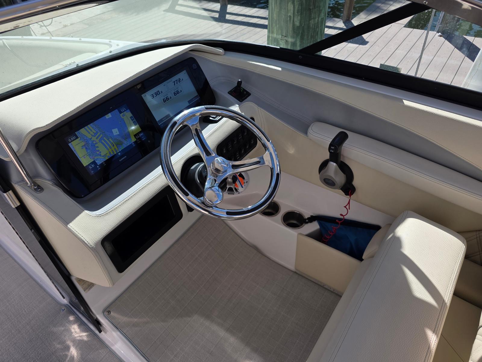 Dual Garmin 12" Displays, Aftermarket Anchor windlass, Bow walkthrough doors, Cockpit table, Cockpit and bow cover, Bow shade, Bow thruster, Trim tabs, Fusion stereo system, Full head porcelain, Stainless sink, Retractable aft seat, Power Hard Top retractable.