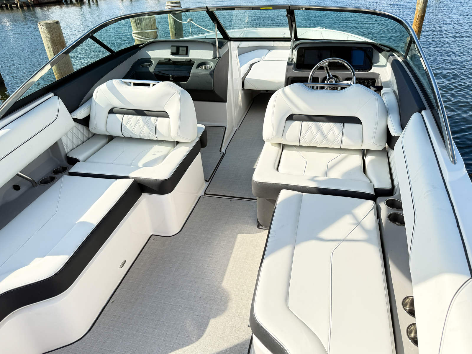 The Regal LX4 Bowrider is designed with practicality in mind, making ownership both enjoyable and convenient. The Dual Battery Switch with Tray and Cables offers peace of mind during extended outings, ensuring you always have reliable power. Docking Lights and Fender Clips simplify the process of docking and securing your boat, making it easy to handle even in busy marinas. The PowerTower provides versatile storage options, keeping your gear organized and accessible.Fuel efficiency is a key advantage of the LX4’s advanced engine, allowing you to spend more time on the water and less time refueling. The spacious cockpit and bow area offer ample storage for personal items, water sports equipment, and refreshments, making it easy to prepare for any adventure. The trim tabs enhance maneuverability, allowing you to navigate tight spaces and varying water conditions with confidence.