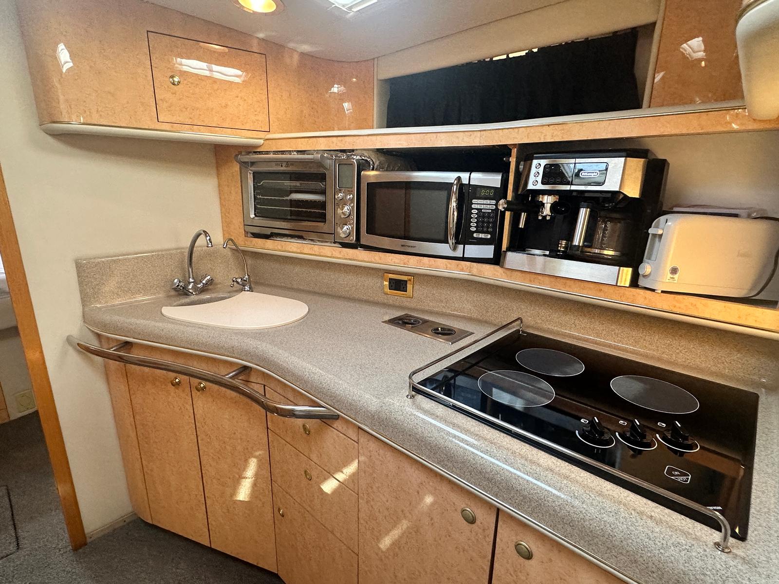 Under the hood, the Sundancer 450 is powered by twin engines, delivering a combined 840 horsepower. With only 428 engine hours, these motors promise robust performance and longevity, ensuring many more seasons of smooth cruising ahead. The dual-engine setup provides enhanced maneuverability and stability, making docking and navigating tight spaces a breeze. Whether you’re cruising along the coastline or heading out for a weekend adventure, the Sundancer 450’s powerful engines offer the speed and reliability you need for a truly exhilarating experience on the water.